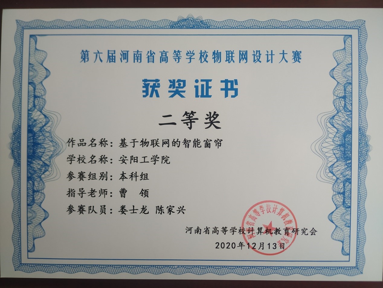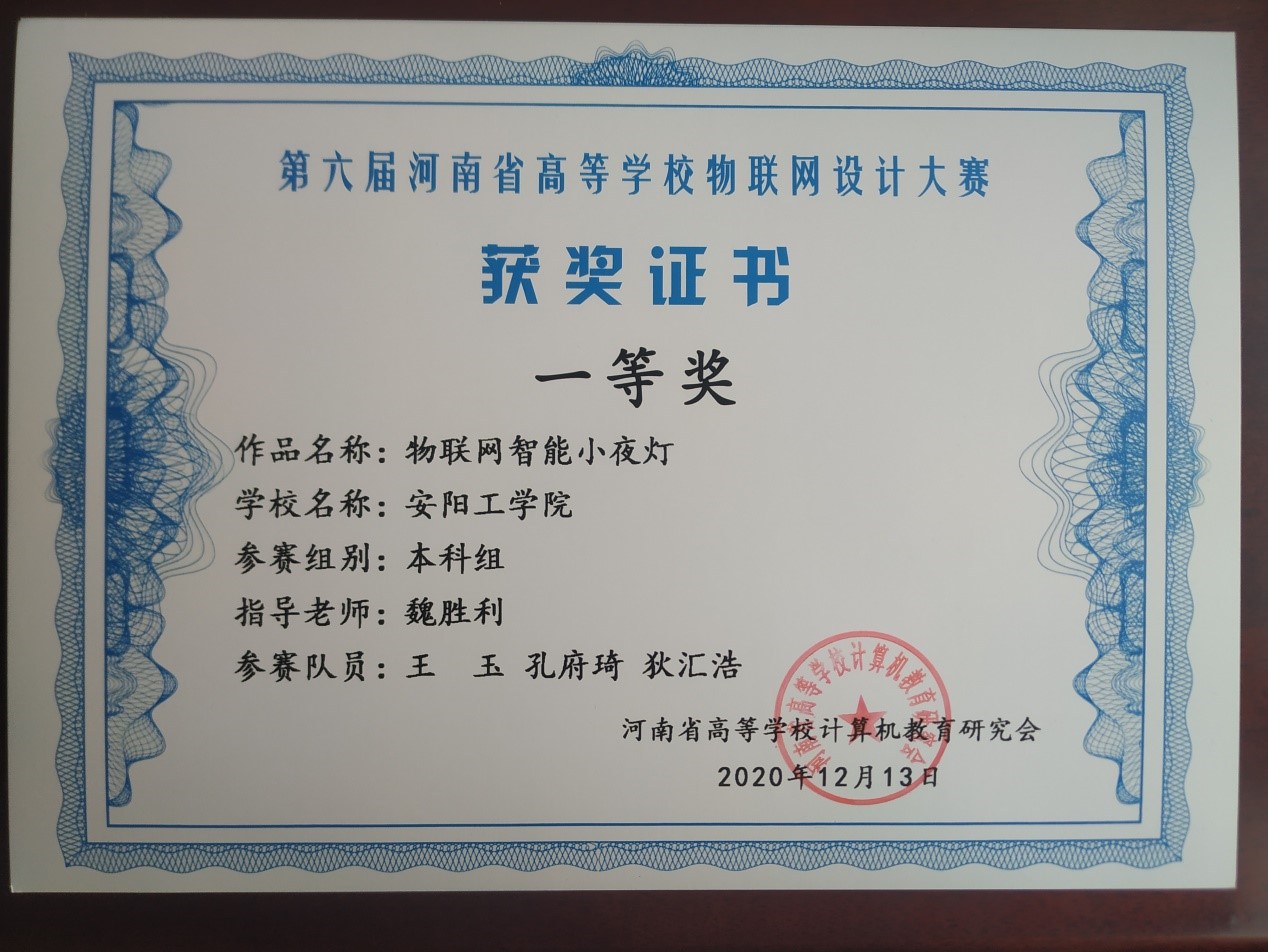 由河南省高等学校计算机教育研究会主办的第六届河南省高等学校物联网设计大赛于上周落下帷幕。此次大赛吸引了包括郑州大学、郑州轻工业大学、河南理工大学在内的二十多所高校参赛。经过线上作品展示与答辩,我校久久久久亚洲物联网工程专业王玉等同学设计的“物联网智能小夜灯”获一等奖,娄士龙等同学设计的“物联网智能窗帘”获二等奖。