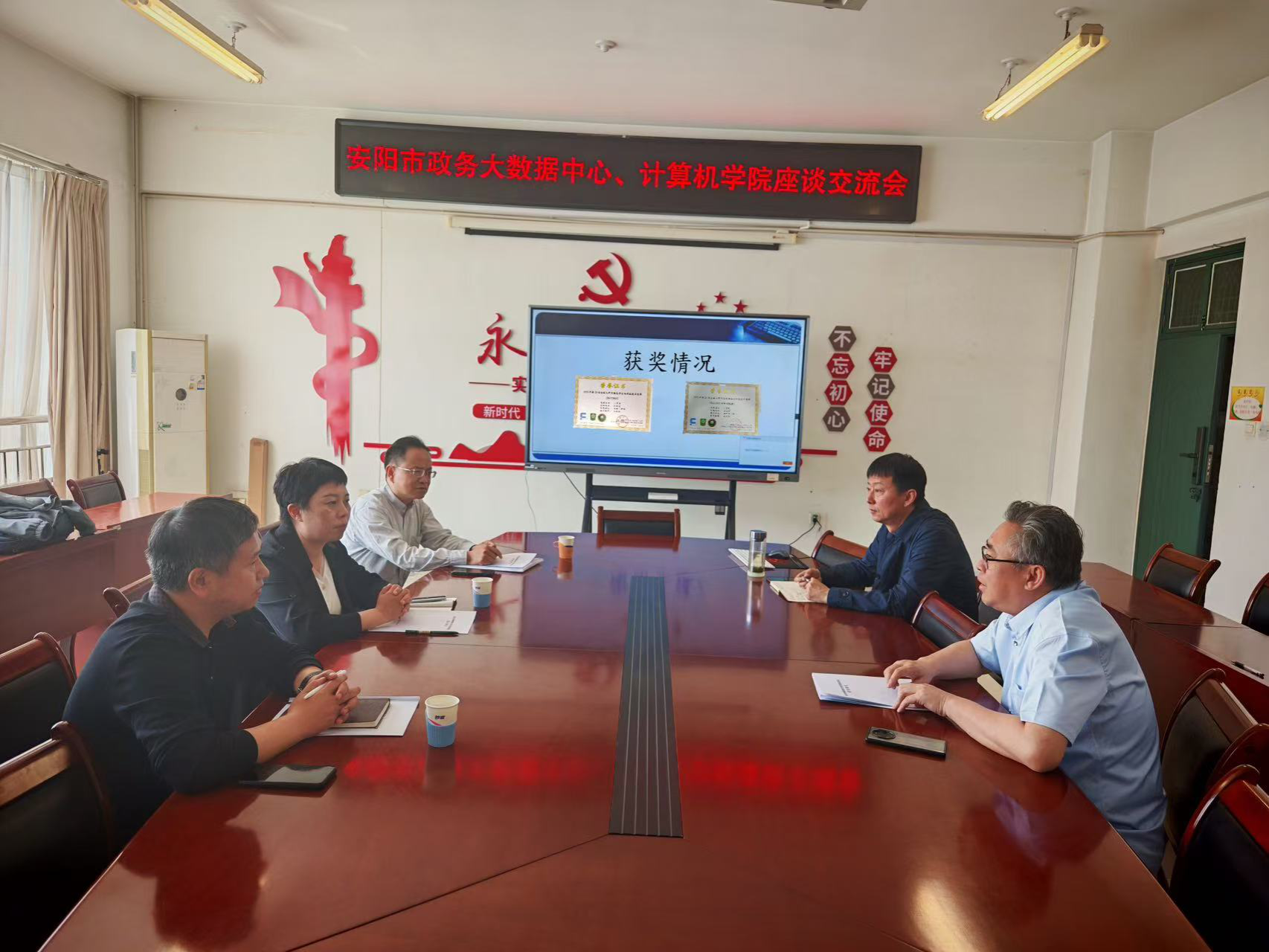 2025年4月25日,安阳市政务大数据中心来我院“政校联动,数智赋能”专题交流会,双方围绕政务系统安全防护体系构建、网络安全人才培养机制等议题展开深入研讨,旨在深化政校协同合作,助力安阳市数字政府建设与产业数字化转型。安阳市政务大数据中心副主任马进先、安阳市政务大数据中心安全保障科科长侯亚楼、我院院长孙高飞、副院长李阳出席交流会。